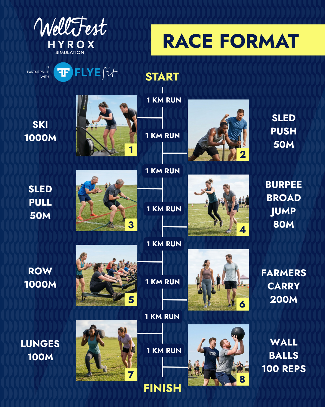The WellFest HYROX Sim in partnership with FLYEfit will follow the classic HYROX race structure: